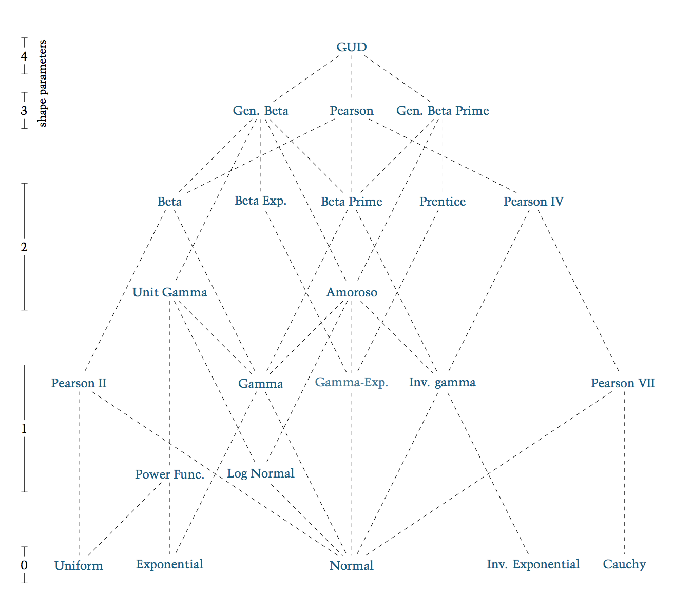 - Over 170 named univariate continuous probability distributions, and at least as many synonyms.