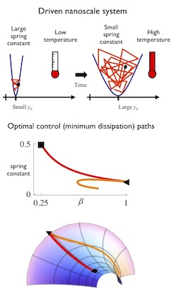 The lower part of the figure shows that optimal protocols appear complicated, even for simple systems. But with a change of coordinates we can see that the minimum dissipation protocols are straight lines (technically geodesics) on a curved surface. Thermodynamic control near-equilibrium has a Riemannian geometry (similar to general relativity), and we can use this mathematics to design and analyze molecular machines.